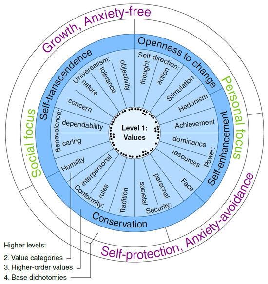 - Schwartz, S.H.; Cieciuch, J.; Vecchione, M.; Davidov, E.; Fischer, R.; Beierlein, C.; Ramos, A.; Verkasalo, M.; Lönnqvist, J.E.; Demirutku, K.; et al. Refining the theory of basic individual values. J. Personal. Soc. Psychol. 2012, 103, 663. [Google Scholar] [CrossRef] [PubMed]