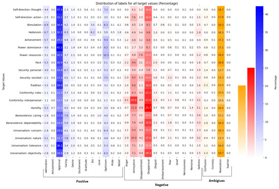 Fine-grained emotion distribution of human values. The y-axis represents the value category of the dataset at level 2, and the x-axis shows the fine-grained emotions from the original taxonomy of GoEmotions. The blue color in this heatmap is assigned for emotions under positive sentiment categories, and red and orange indicate emotions of negative and ambiguous categories, respectively, [2].