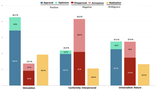 Indeed, the same pattern is not as explicitly observed when contrasting the categories of ‘self-transcendence’ and ‘self-enhancement’ concerning positive emotions. Conversely, when examining negative emotions, ‘self-enhancement’ values exhibit a relatively lower overall percentage compared to ‘self-transcendence’ values.