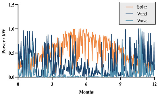 We collected meteorological data from the maritime areas surrounding Weihai City in Shandong Province, China, for the period from 1 January to 31 December 2019. Through the use of power conversion formulas, we calculated the annual power generation. For ease of analysis, the calculated data were normalized, as shown in Figure 1.