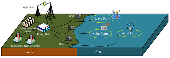 Based on the aforementioned analysis, we considered a wind–solar–wave multi-energy complementary system, as shown in Figure 3. This system consists of three microgrids, each equipped with renewable energy generation facilities and Distributed Generation (DG) devices as backup power sources. In this system, the generation of various energy sources is subject to environmental conditions, leading to uncertainties and volatility. To balance power generation with load demand, surplus electricity can be stored in the energy storage system for future use. Moreover, when the renewable energy generation exceeds load demand, this surplus electricity can also be sold through energy transactions with the main grid, thereby achieving optimal energy allocation and maximizing economic benefits.