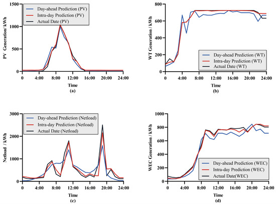 We compared the day-ahead forecast and intra-day forecast results for a typical day and found discrepancies between them. This is because the forecasting error tends to decrease as the time approaches closer to the actual operation. The day-ahead forecast is conducted 24 h before the actual operation, while the intra-day forecast is carried out 1 h prior, utilizing the latest meteorological data and system status information, which may not be as accurate during the day-ahead forecast.