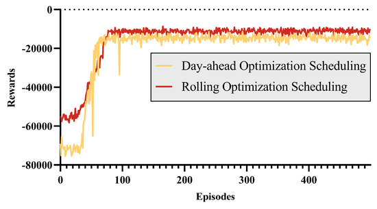The forecast data were input into both the day-ahead optimization DRL model and the day-ahead and intra-day rolling optimization DRL model, with the reward value convergence curve shown in Figure 7. It can be observed that under the optimization of the DDPG algorithm, the reward gradually increases and stabilizes quickly. The reward for rolling optimization scheduling is greater than that for day-ahead optimization scheduling. This is because the rolling optimization scheduling has a more precise scheduling plan, which reduces penalty costs.