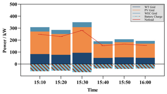As indicated in the hypothetical Figure 8, the intra-day adjustment phase allows for the precise allocation of electricity plans every 10 min, which is not feasible with day-ahead scheduling. It is important to note that the intra-day adjustment phase of rolling optimization scheduling outputs scheduling plans on a 10 min timescale, whereas day-ahead scheduling operates on a 1 h basis. To more intuitively analyze the changes and costs between rolling optimization scheduling and day-ahead optimization scheduling, we standardized the time scale. We aggregated the 1 h intra-day adjustment plans, converting the unit of measurement from power generation capacity (kW) to electricity generation and consumption (kWh).