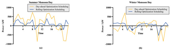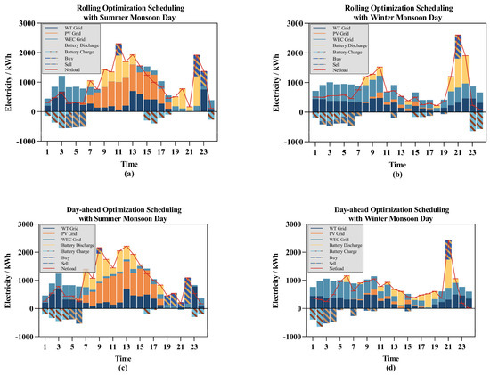 The scheduling result: (a) the rolling optimization scheduling with summer monsoon days; (b) the rolling optimization scheduling with winter monsoon days; (c) the day-ahead optimization scheduling with summer monsoon days; (d) the day-ahead optimization scheduling with winter monsoon days.