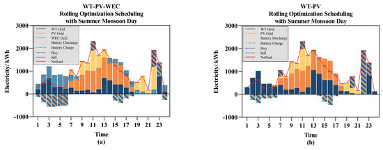 The impact of the WEC microgrid on the scheduling system: (a) WT-PV-WEC; (b) WT-PV.