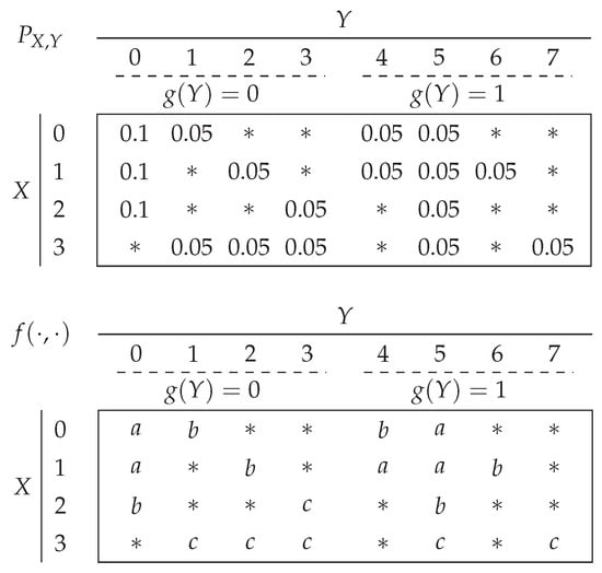 Consider the probability distribution and function outcomes depicted in Figure 2, with , , , and . Let us show that the “pairwise shared side information” assumption is satisfied. The source symbols share the side information symbol 0 (resp. 5) when (resp. ). The source symbol shares the side information symbols with the source symbols , respectively, when , and the source symbol 3 shares the side information symbol 5 with all other source symbols when .