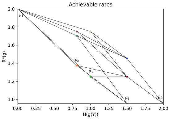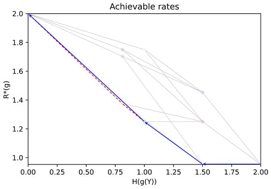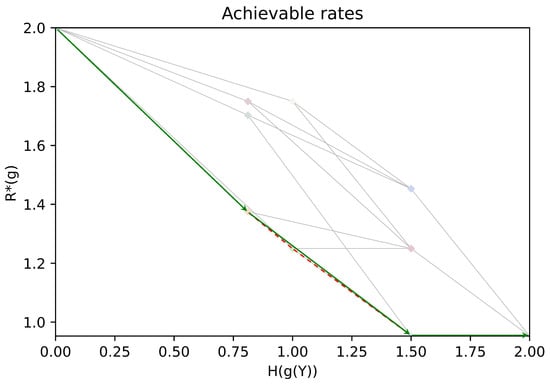 In the zero-error coding for computing problems with encoder side information, it can be observed that a “coarse” encoder side information (e.g., if g constant) yields a high optimal rate , whereas a “fine” encoder side information (e.g., ) yields a low optimal rate . The side information design problem consists of determining the best trade-offs between the optimal rate and the quality of the encoder’s side information, which is measured by its entropy . This expression describes the optimal rate of a zero-error code that transmits the quantized version of Y via the g function. The best trade-offs correspond to the Pareto front of the achievable set, i.e., whose corner-points cannot be obtained by a time sharing between other coding strategies. In short, we aim at determining the Pareto front of the convex hull of the achievable pairs .