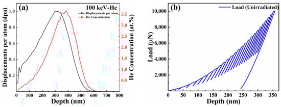 (a) The depth-dependent dislocation damage (dpa) and distribution obtained by SRIM simulation of the alloy, and (b) variation curve of load with the depth in nanoindentation (cyclic loading).