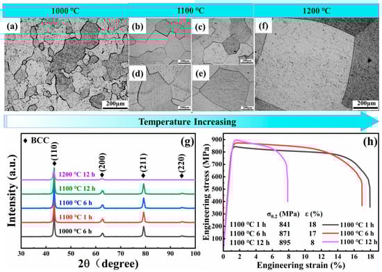 The metallographic diagram ((a) 1000 °C/6 h, (b) 1100 °C/1 h, (c) 1100 °C/6 h, (d) 1100 °C/12 h, (e) 1100 °C/24 h, and (f) 1200 °C/12 h) and corresponding XRD diagram (g) of the alloy heat treated at different temperatures and time, and the stress–strain curve (h) at 1100 °C for different time.