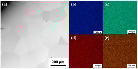 In order to reduce the influence of other factors on the subsequent studies, the alloy was electropolished after homogenization at 1100 °C for 1 h to remove the surface stress [], as shown in Figure 3. The SEM-EDS diagram in Figure 3 exhibits the uniform distribution of the elements of Ti, Zr, Hf, Nb, and Mo, and no additional precipitated phases are generated. Among them, the Mo element cannot be displayed in the figure due to its low content.