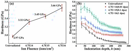 During ion irradiation, defects such as dislocation loops, helium bubbles, and stacking fault tetrahedrons are generated. These irradiation-induced defects are obstacles to the dislocation motion [,]. Therefore, the yield strength and hardness of irradiated materials enhance. In general, the hardening of the irradiated materials depends not only on the interaction among dislocations, but also on the density and distribution of irradiation-induced defects [].