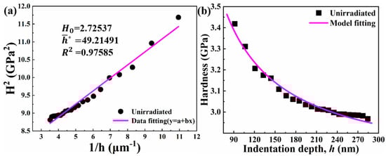 The values of and are obtained by fitting the Nix–Gao model data of unirradiated materials. On this basis, the experimental vs. curve can be transformed into vs. curve. According to Equation (6), it is transformed into []