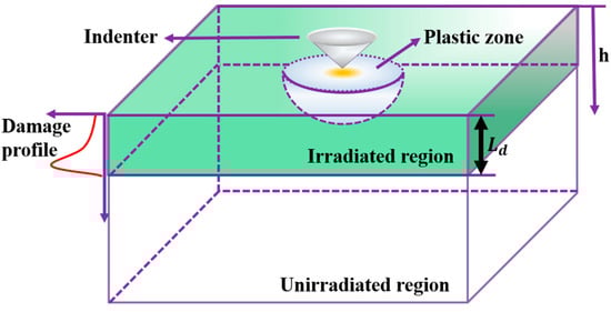 Through the above formula, it reflects the idea that an irradiation layer is generated on the surface of the sample after irradiation. With the indentation of the nano-probe indentation, a plastic zone will be generated below the probe (the specific nanoindentation of the irradiated sample is shown in Figure 6). In the region , increases with the increase in the indentation depth, . In the region of , firstly increases with the increase in the indentation depth until the threshold depth is reached, and reaches the maximum. When , decreases monotonously with the increase in the indentation depth . The reason for the non-monotonic result is that, when , with the increase in the indentation depth , the plastic zone expands deeper into the material with a higher defect density, so the average defect density on the plastic zone increases. When , the plastic region just touches the unirradiated region, and the plastic region expands around to include more volumes of materials with high defect density, so the average defect density of the plastic region still increases with the increasing indentation depth, . After , when the plastic zone below the irradiation zone is large enough, the average defect density in the plastic zone begins to decrease with the further increase in the indentation depth, .