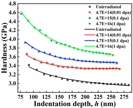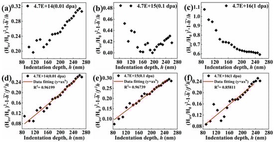 By constantly adjusting the value of the scale factor , it is found that the right-most hardening trend of the irradiation-hardening part in Equation (10) can be obtained within a specific scale factor range. The values of , , and of the alloy under different doses of irradiation are shown in Table 2. It can be found from Table 2 and Figure 7d–f that the indentation depth of the nano-indentation obtained by the experiment is basically within the irradiation zone. Moreover, to minimize the impact of the surface on the nanoindentation results, the data points that measure less than 80 nm are excluded from the analysis. The hardening model with the change of depth after irradiation can well describe the size effect of indentation after irradiation considering the scale factor . The specific fitting results are shown in Figure 8. Last but not least, the part of the elastic deformation effect is less affected and, therefore, is not considered for the time being in the selected range (80–260 nm) [].