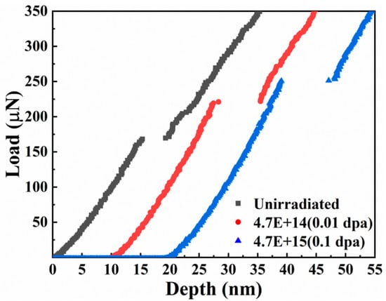 reflects the space size of the dislocation storage range, which is closely related to the nucleation and movement of dislocations. In the process of nanoindentation, the activation of dislocations is a thermal activation process of stress bias. In this process, the critical stress and the activation volume V are important [,]. As the irradiation dose increases in Figure 9, the greater the load required for pop-in to appear. It indicates that, the larger the irradiation dose, the more difficult the dislocation nucleation, and the greater the critical shear stress required for nucleation. The larger the width of pop-in, the greater the dislocation density of nucleation under the indenter [,]. The invisibility of pop-in under 1dpa is mainly that there are already dislocations in the material under higher irradiation damage. The original dislocations are activated to achieve plastic deformation, and the pop-in events may not be obvious. In the face of increasing nucleation dislocation density and decreasing plastic zone, it can be predicted that the activation volume of dislocations may be reduced to a certain extent.