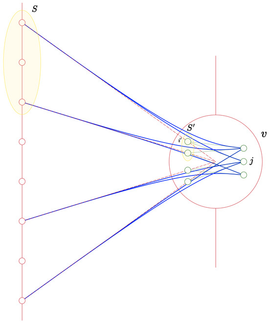 An example of a bipartite graph G (dashed, red), a small gadget (dotted, green), and the routed product (solid, blue). The set has a neighbour , and so S is associated with a set of left-side vertices of the copy of associated with v. Since is the only edge connecting j to in , we have that is a unique neighbour of S in .