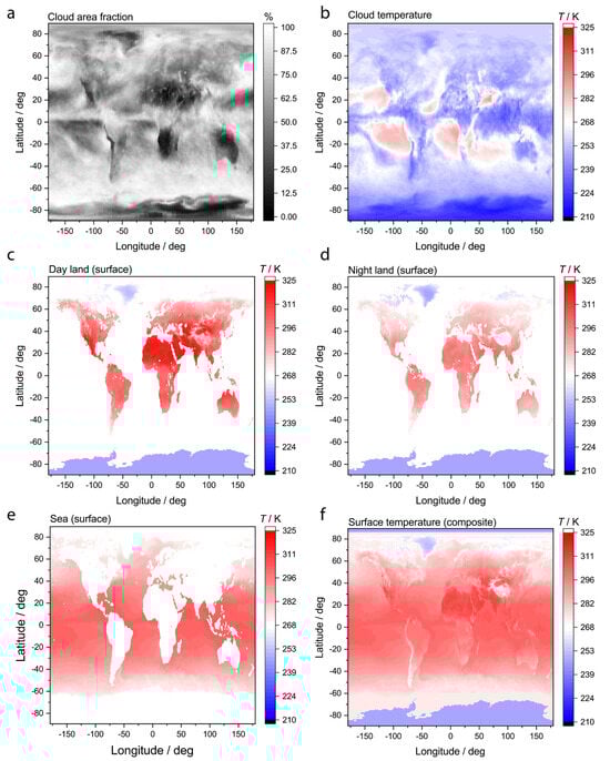 An example of a complete set of temperature data required to calculate the total entropy exchanged with space using Equation (6) for one time point is provided in Figure 2. The cloud area fraction is presented in Figure 2a, the cloud temperature in 2b, and the composite surface temperature in Figure 2f with the constituents used to construct that composite in Figure 2c–e.
