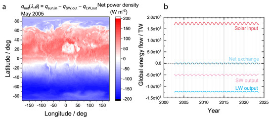Net exchanges of radiation with space. (a) Example map of net radiation exchange as a function of position for May 2005. (b) Globally integrated radiation exchanges as a function of time.