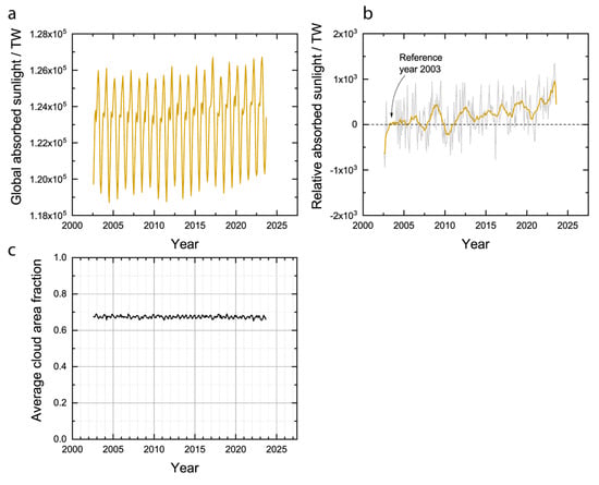 Absorbed sunlight. (a) Globally integrated solar input minus SW output. (b) Globally integrated solar input minus SW output relative to 2003. Grey line is raw data in (b) and orange line is moving average with 12-month window. (c) Area-weighted average cloud area fraction calculated from CERES dataset.