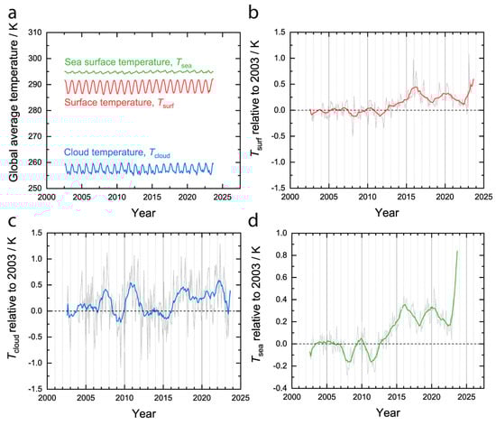 Average surface, cloud, and sea temperatures. (a) Area-weighted average surface (red), cloud (blue), and sea (green) temperatures. Area-weighted average (b) surface, (c) cloud, and (d) sea temperatures relative to 2003. Colored lines in (b–d) are moving averages with a width of 12 months.