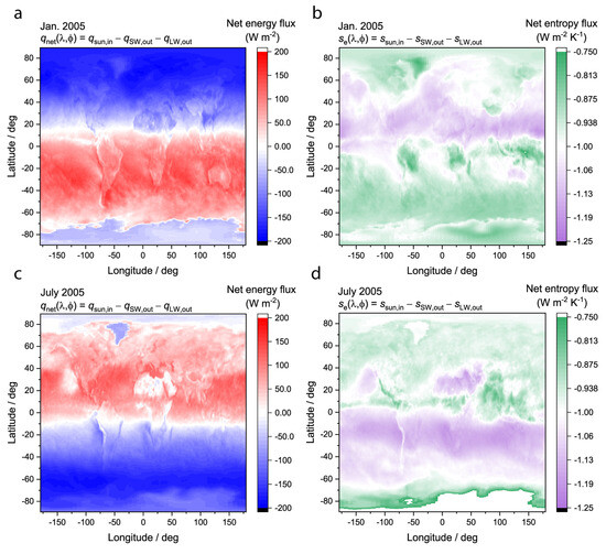Everywhere in the world, at all times examined in the dataset, the net entropy flux was negative, consistent with earlier results [34], the second law of thermodynamics, and the assumption that radiation comprises the largest energy and entropy exchanges when averaged over a 1° × 1° pixel. The more negative the entropy flux is, the higher the local entropy production rate is due to the radiation exchanges. Plotted in Figure 6a,c are the net energy flux maps for two arbitrary winter/summer months: January 2005 and July 2005. Plotted in Figure 6b,d are the net entropy flux maps for the same months. As expected, the net entropy flux is more negative in the hemisphere experiencing winter because the net energy flux is negative, and the temperature is smaller than the hemisphere experiencing summer. When integrated over the boundary, the portion of the world that receives less solar input is the portion of the world that contributes more to the global entropy production rate. The conclusion is visualized as a coincidence between the blue regions of the net energy flux maps (outgoing net energy flux) and the pink regions of the entropy flux maps (most negative net entropy flux), which change with the season but are correlated at a given time point. Integrating maps such as those in Figure 6b,d over the entire boundary enclosing the Earth using Equations (5)–(7) provides the global entropy production rate in time.