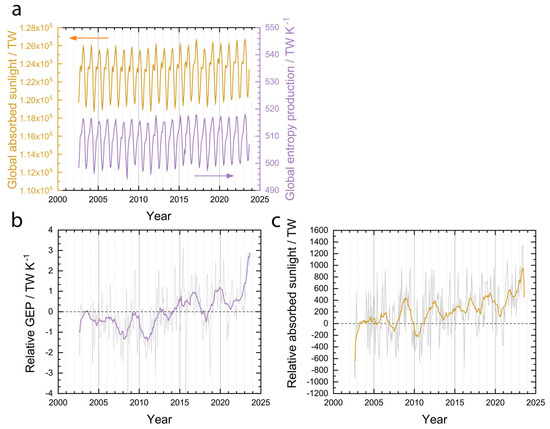 Global absorbed sunlight and entropy production rate. (a) Global absorbed sunlight (orange) and entropy production rate (purple). Global entropy production rate (b) and absorbed sunlight (c) relative to 2003. Colored lines in (b,c) are moving averages with a 12 month window, grey lines are raw data.