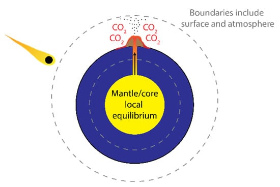 Viewing volcanic impulse inputs, which can also affect albedo and greenhouse gas concentrations, as external to the surface and atmosphere requires redrawing of the boundaries of Figure 1. In Figure 1, the boundary was drawn around the entire Earth, which would include the mantel and core that are the source of volcanic activity. The boundary can be redrawn to include only the atmosphere and surface (Figure 8). The redrawing of the boundary in this way does not affect the energy and entropy balances described above, since the radiation inputs and outputs are so much larger in magnitude than the volcanic activity when averaged over time. However, this redrawing of the boundary makes the volcanic impulses external to Gaia, meaning those inputs are boundary interactions and not subject to the governing principle. They are externalities, and like celestial body impacts, Gaia is expected to damp out the volcanic impulse boundary interactions, which is a notion that is consistent with prehistorical climate evidence [45]. The core and mantel being governed by local equilibrium seems like a reasonable assumption. To our current knowledge, there is no external energy source to supply the core, and the energy flux from the core directed outwards is small with respect to the radiation exchanges with space at the surface.