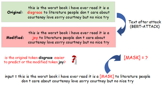 Procedure of MDL computation with masked language modeling (MLM): An initial review is sourced from the original dataset and subjected to the BERT-ATTACK module, resulting in the generation of an adversarial review. MLM is employed to evaluate the ‘amount of effort’ of prediction for two categories of tokens: the original token and the modified token. Subsequently, the minimum description length (MDL) is computed based on these evaluations.