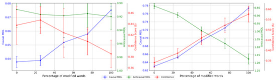 To further assess our idea, we construct multiple Bs that involve different percentages of the modified tokens and evaluate how the MDL values vary with the change of the fraction of modified tokens. We first randomly select tokens from M as B. Then, we construct by randomly selecting tokens from B that are truly modified by the attacking model and from M that are not modified. Using this method, we create , , , , and where is equivalent to B. Then, we generate similarly for each and compute . We repeat the experiment 15 times for each p and present the results in Figure 3. We can see that the causal MDL rises with an increasing percentage of modified tokens for both attacking models. This is as expected according to our hypothesis that the MDL reflects the algorithmic information of the attacking model, since a greater number of modified tokens would require a longer code-length to compress the attack mechanism.