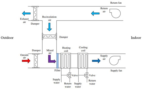 Air handling unit (AHU) with air recirculation (adapted from []).