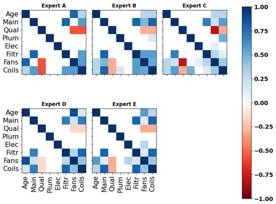 This appendix contains the correlation matrices obtained from the assessments of expert A (Appendix C.1), expert B (Appendix C.2), expert C (Appendix C.3), expert D (Appendix C.4), and expert E (Appendix C.5). In particular, each figure includes the matrices retrieved from the participants’ responses to the (a) main and (b) seed questions.