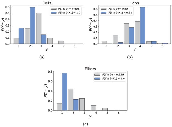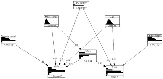 Then, the main elements composing an AHU must be identified, which clearly stand out from Figure 4: (v) plumbing supply, (vi) electrical supply, (vi) exhaust fans, (vii) heating and cooling coils, and (vii) the filters. In their study on gradual fault prediction, Ref. [] limited their effort to defects related to the supply fan and the cooling coil, obtaining satisfactory results. However, the present research also investigates the relation between components. Consequently, all the aforementioned elements are included and grouped in the following variables: coils, fans, and filters. The decision to group components is knowingly oversimplistic and reflects the exploratory dimension of the research, whose focus is on the elicitation of experts’ judgments rather than the creation of a complex and accurate model. For practical purposes, the condition of these components—and the associated variables—is defined in accordance with the 1–6 scale of NEN 2767, the Dutch standard for building condition assessment, where 1 represents an ‘excellent’ condition and 6 a ‘very bad’ one; see [,].