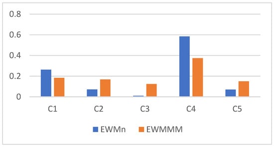 The comparison of two systems of weights is presented in Figure 1. We can observe that the max–min method in the EWMMM resulted in a flattening of the differences between criteria values. The most important criteria (C1, C4) obtained lower weights, while the least important ones (C2, C3, C5) received higher weights compared to the EWMn.