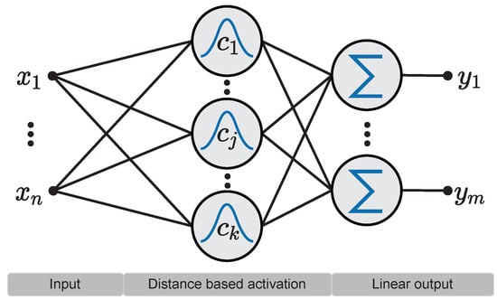 Radial Basis Functions (RBFs) are a special class of basis functions used for multivariate interpolation of scattered data, where the final interpolating function is obtained by a linear combination of multiple RBF kernel outputs. Kernel functions are of a fixed type, e.g., the Gaussian density function to mention the most common one. In this approach, each RBF kernel calculates its output based on the distance between an input vector and the kernel center by leveraging some pre-defined proximity measure. In terms of artificial neural networks—this approximation scheme is a network with a single layer of RBF kernels, followed by a linear weighting layer. Primary, the Euclidean norm is used for this distance calculation, see Figure 1. More general distance measures such as the Mahalanobis distance have been introduced as proximity measures. This allows for more complex contributions of the input features to the kernel activation. Fundamental mathematical results on RBF can be found in the books by Powell [2], Buhmann [3] or Fasshauer [4], and in the papers authored by Micchelli [5], Dyn [6] or Schaback [7].