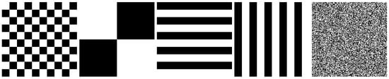 Contrast in images can be quantified through various metrics such as entropy and standard deviation. However, it is crucial to note that higher contrast does not always equate to higher image quality, particularly in the context of thermal images that may contain various types of noise. For instance, consider Figure 1, where five artificially generated images containing an equal number of black and white pixels are presented. Surprisingly, despite sharing identical entropy and standard deviation values, these images exhibit varying levels of visual contrast and clarity.