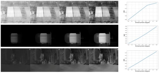 The monotonic behavior of a quality metric is a vital characteristic, indicating that it should either increase or remain consistent as image quality improves. Illustrated in Figure 3 are enhancement results for several thermal images, showcasing four different levels of enhancement. Corresponding graphs in the figure depict metric values for different enhancement parameters. It is evident that the BIE measure follows a consistent pattern of growth as visibility and contrast in the results improve, thus affirming its status as a quality metric with monotonic characteristics.