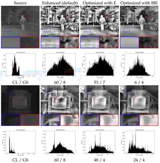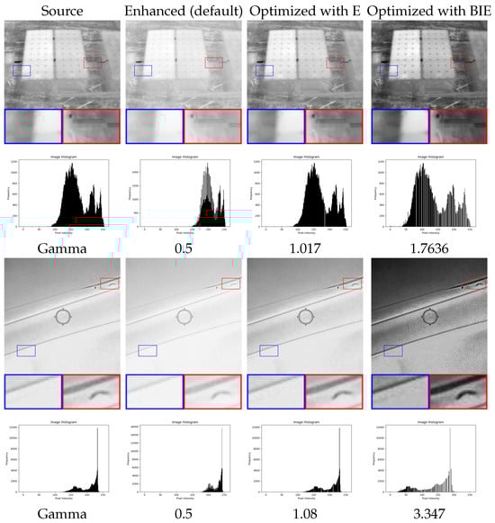 We employed classic enhancement algorithms for their parameter optimization using E and BIE metrics as fitness functions. For instance, in Figure 5, we demonstrate the results of optimizing the gamma parameter within the [0, 5] range of the GC algorithm for two images, along with their histograms. It is evident that the optimized result exhibits the best visual contrast. Similarly, Figure 6 illustrates the optimization process for another algorithm, CLAHE, focusing on the parameters clip limit (CL) within the range [1, 60] and grid size (GS) within [4, 40]. In the first image, the default parameters and E-based optimization result in an overenhanced and noisy output, while the BIE selects the optimal parameters (CL = 6 and GS = 4) for enhanced image quality.