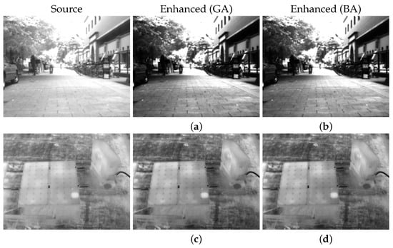 Figure 7 illustrates the maximization of the parameters in the GC and CLAHE algorithms using the proposed BIE metric as the fitness function for both GA and BA. It showcases the enhanced results of thermal images alongside optimization graphs illustrating metric values across parameter variations throughout the process. This analysis was conducted using the PyGAD (version 3.3.0) and BatAlgorithm (version 0.3.1) Python packages, with both optimizations executed over a similar 20 iterations. The parameters are maintained at default values, such as a 50% mutation rate and 20 parents mating in GA, and a population size of 50 with loudness and pulse rate set to 0.5 in BA. The similarity in optimization results and graphs across algorithms suggests that the choice of algorithm may not significantly impact the outcome. For instance, in the case of the first image, GA and BA selected 2.59 and 2.49 as the best gamma parameters, indicating a high degree of similarity. This similarity may become even more pronounced with a higher number of iterations. However, GA stands out for its simplicity and faster execution time, making it preferable for this application.