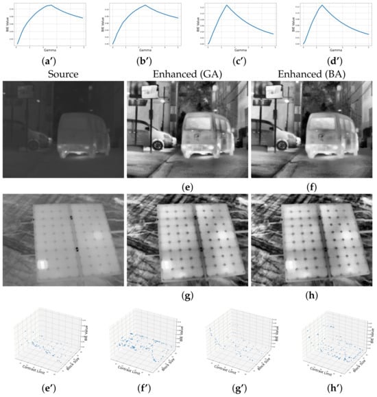 Results of the optimization of GC and CLAHE algorithms using GA and BA with BIE as a fitness function. Each graph represents the parameter optimization process for each enhanced image. For example, in (a–h), the image is the result of the optimization process (a’–h’).