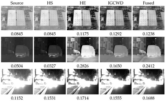 Enhancement of thermal images has emerged as a critical area of research, motivated by the necessity for enhanced visualization and analysis in diverse applications, given their inherent low contrast and visibility. Classical algorithms commonly employ variations of histogram equalization or gamma correction for enhancement [,]. Histogram-based methods typically aim to maximize the entropy of the image or blocks within the image, while gamma correction methods involve adjusting the gamma value to modify the brightness and contrast of the image. A summary of these methods is provided in Table 1.