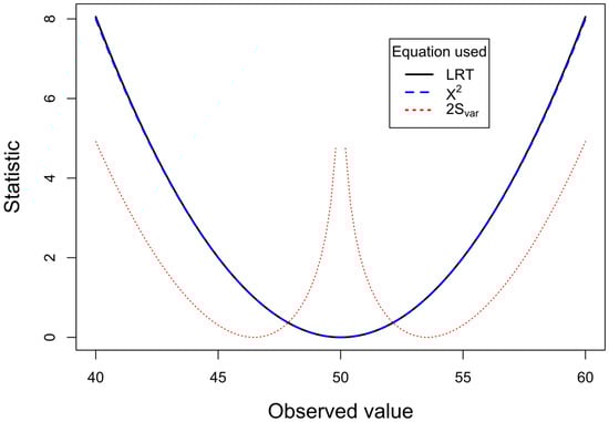 Calculated statistics plotted for 2 × 2 contingency table with N = 200 and all marginal totals fixed at 100. The observed values for one of the cells vary from 1 to 99, while expected values are 50 for all cells. The plot for the LRT statistic (Equation (3)) is shown by the black continuous line, test (Equation (1)) is shown by the blue dashed line, and the (Equation (6)) is shown by the red dotted line. Applying Williams’s correction [29] to the LRT has a negligible effect and produces a line that closely overlaps with the LRT line.