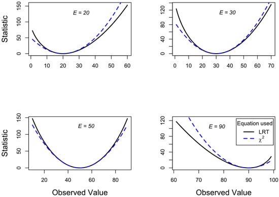 The statistic using LRT (Equation (3), black continuous line) and test (Equation (1), blue dashed line) are plotted for different fixed expected values (see inset expected E values from 20 to 90), where the observed values vary in each plot. Plots use 2 × 2 contingency table data where N = 200 and all marginal totals fixed at 100. The plot for E = 50 is similar to that shown in Figure 1, but without the line. For display purposes, different scales are used for vertical and horizontal axes in each plot.