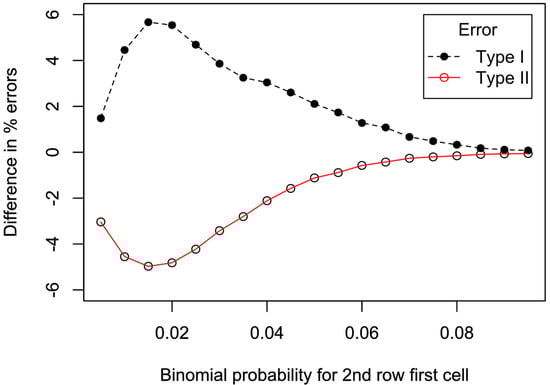 Difference in percentage of type I and type II errors for LRT— analyses. For type I errors (dashed line, filled circles), the same binomial probabilities were assigned to the first cell of each row and systematically changed from 0.005 to 0.095. For type II errors (continuous line, unfilled circles), the first cell was fixed with a probability of 0.1, while the binomial probability for the first cell of the second row was systematically changed from 0.005 to 0.095. Data were obtained by Monte Carlo simulations of randomly generated binomial numbers, with 50,000 repetitions for each point. R code for this and other figures is available in Supplementary Data.