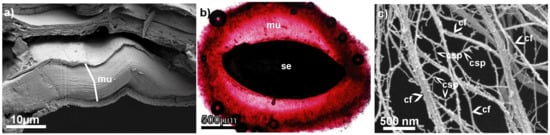 The seed mucilage structure before and after hydration with water. (a) Cross section of the mucilaginous cell showing pressed mucilaginous material in a dry state (mu) (SEM); (b) mucilage envelope (mu) formed after hydration around the seed (se) (here, mucilage stained with Ruthenium Red); (c) Critical point drying and subsequent SEM visualization of the spatial structure of the mucilage envelope. cf—cellulose fibrils; csp—cross-linking polysaccharides (pectins and hemicelluloses). For the details of the techniques, see [8].