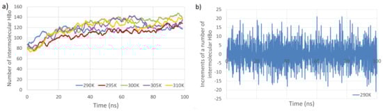 The time evolution of the number of intermolecular HBos and the changes in this number at subsequent time points (time series) are presented in Figure 3. Figure 4 depicts the time evolution of the number of intermolecular HP interactions, as well as the number of PW HBos.