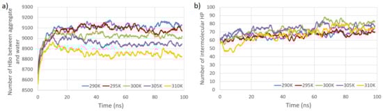 In the present study, the number of HBo and HP interactions was quantified for the model mucilage system undergoing an aggregation process at five temperatures ranging from 290 to 310 K. For such a relatively simple system, classical MD simulations with the AMBER FF (with the quantum corrections described above) were considered adequate, as we focused solely on standard, non-covalent interactions within the system immersed in water, which are well predicted by this semi-classical FF [22]. Time series data containing changes in intermolecular HBos; HBos between mucilage components, polysaccharides, and water (polysaccharides–water HBos; PW HBos); and intermolecular HP interactions as a function of time were obtained from these simulations and subsequently analyzed using the recurrence plot method.