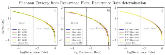 Entropy computed from recurrence plots according to point 4 in Section 2.3 for various temperatures and inter-molecular bonds: HP (a), HBo (b), PW HBo (c). A linear relation between the logarithm of entropy and the logarithm of the recurrence rate can be observed to the left of the dashed line. The following parameters were used for all data series (see Equation (2)): and . Determination of these parameters was performed by the automatic method described in point 1 in Section 2.3 for each data series, then by majority voting.