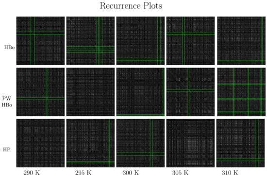 Concerning the lower panel of Figure 6, white regions can be observed, especially for higher temperatures. This is also a meaningful observation tied to molecular dynamics. In particular, if there is a recurrence plot of increments in a series of white regions separated by dark ones, we may expect a stable oscillation (of a number of HP bonds in our case) around the mean value. This interesting pattern was expected, as HP bonds are stronger than the HBos, although they are fewer in number (cf., Table 1).