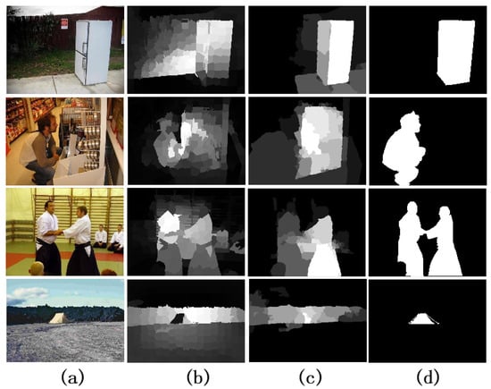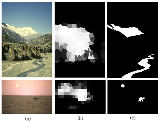But because there were no data training and learning, these methods based on low-level features do not perform as well as the detection methods based on top-down, as shown in Figure 1. The method [14] applied the classification feature of a deep neural network (DNN) to construct dense and sparse labeling maps, respectively, and put the labeling maps into the DNN to produce the final saliency map. It achieves the better detection results than the MR method [12]. The research on the top-down methods has received a lot of attention lately. Typically, top-down methods are task-driven, requiring a machine learning scheme to integrate high-level features into the process that was initially limited to specific objects or hypotheses. DNN is one of them; it outperforms conventional techniques and has demonstrated outstanding performance in computer vision tasks. As a task-driven learning method, DNN can automatically learn the optimal image representation features and classify from a huge amount of training data. The excellent performance of DNN comes from its deep structure; that is, each layer of features is a nonlinear transformation of the previous layer of features. The network’s capacity for nonlinear fitting will get stronger and stronger as the number of layers rises, and the feature extraction ability will also become stronger and stronger, thus being able to extract image features with high semantic information and discriminative performance. The typical methods are as follows: He et al. [15] designed two superpixel input sequences, and used two one-dimensional convolutional neural networks (CNNs) to combine contextual superpixel information to compute the saliency value of each superpixel. Wang et al. [16] used an encoder–decoder network in a recurrent architecture to iteratively improve the saliency map.